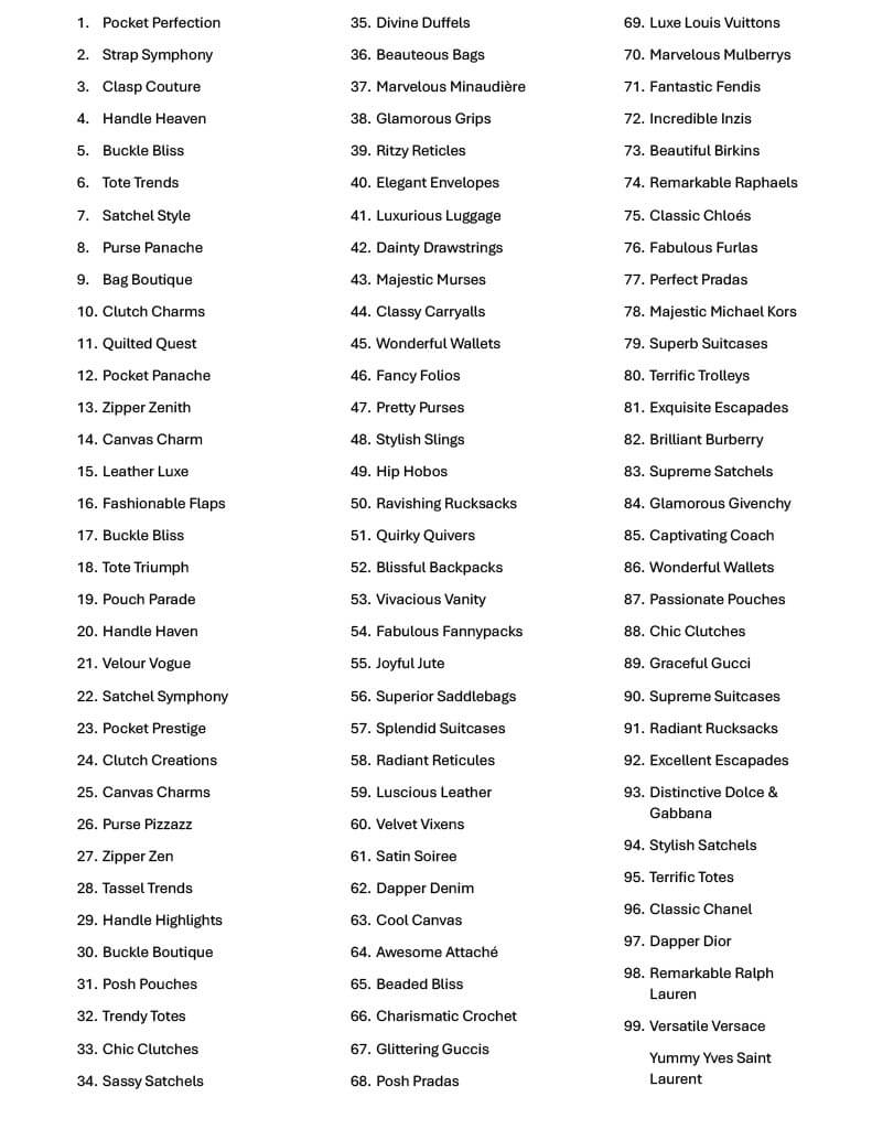 Luxury accessory businesses cater to an upscale market, so it’s important to select a name that reflects elegance, sophistication, and high-quality craftsmanship.